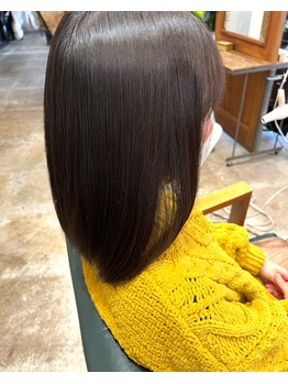 卒業とともにはじめての縮毛矯正をさせていただき、サラサラまっすぐ、自然な感じになりました。薬剤を髪質に合わせて調合し場所によってもコントロールすることで均一な仕上がりになります。一宮市の美容院 lovelica髪質改善や縮毛矯正も人気となっております。髪質改善カラーエステもケアしながらのおすすめメニューです。